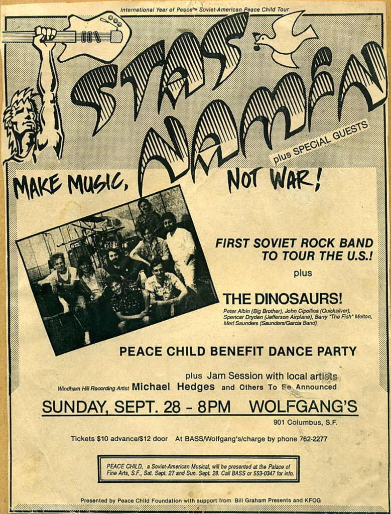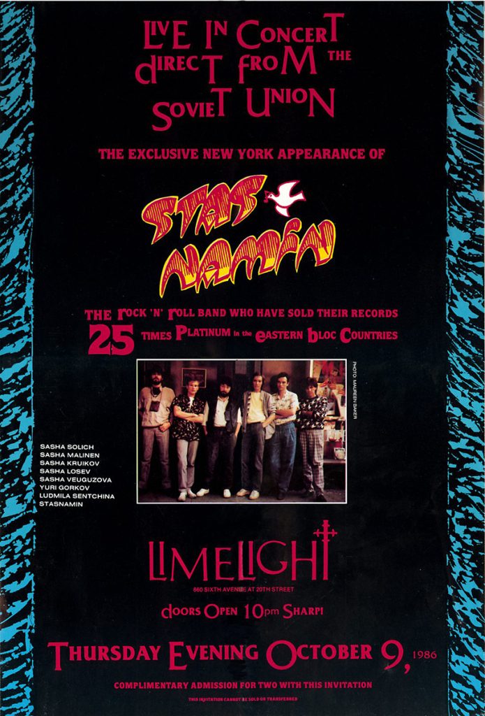 With Mikhail Gorbachev coming to power in 1986, The Flowers obtained freedom, were permitted to travel abroad for the first time, and went on a 45-day tour of the United States and Canada. In New York, Yoko Ono attended a press conference before their concert on John Lennon’s birthday. After that, she invited Stas to her home in Dakota and introduced him to famous New York musicians. In December of the same year, at the invitation of Peter Gabriel, The Flowers participated in the Japan Aid festival.